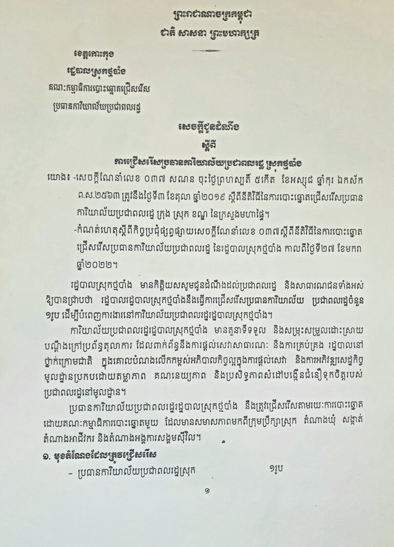 សេចក្ដីជូនដំណឹងស្ដីពីការជ្រើសរើសប្រធានការិយាល័យប្រជាពលរដ្ឋស្រុកថ្មបាំង