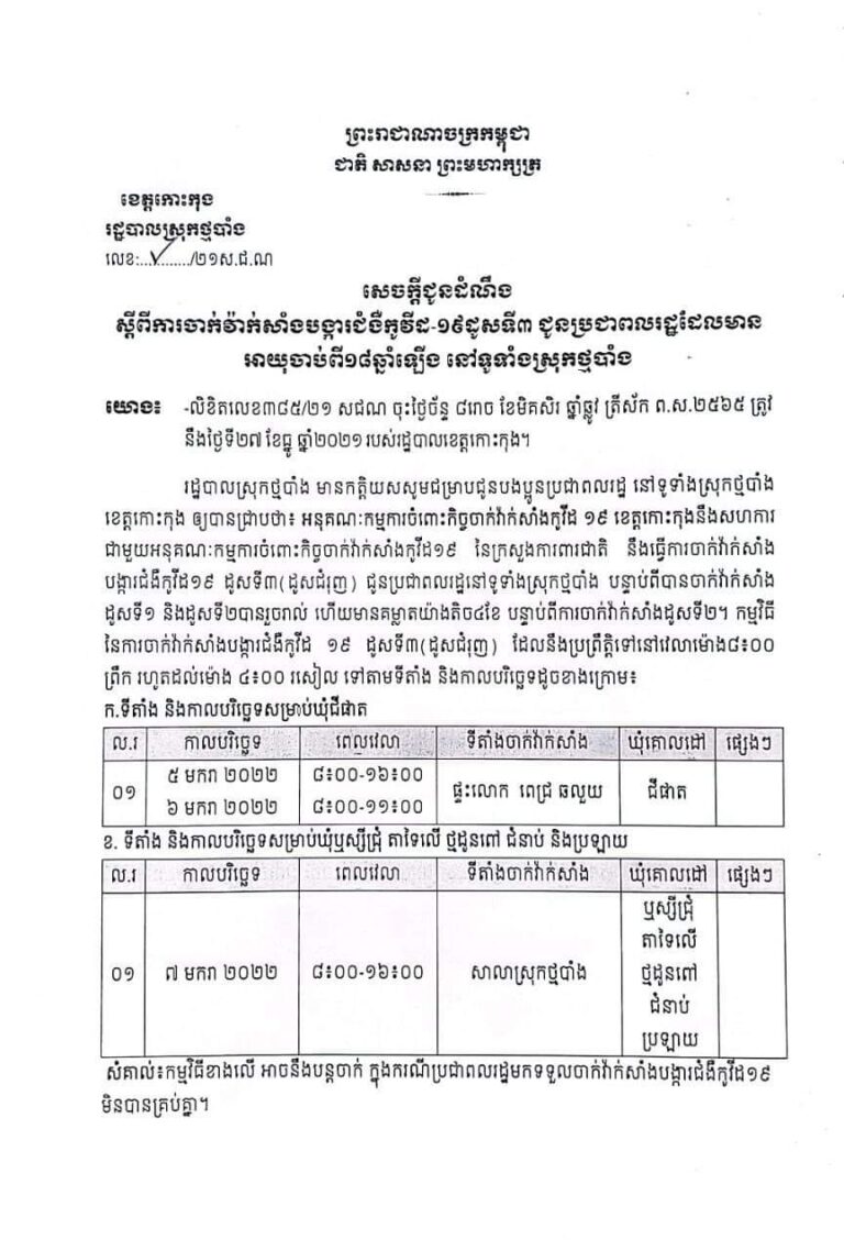 សេចក្ដីជូនដំណឹងអំពីការចាក់វ៉ាក់សាំងលើកទី៣ (ដូសជំរុញ) នៅក្នុងស្រុកថ្មបាំង