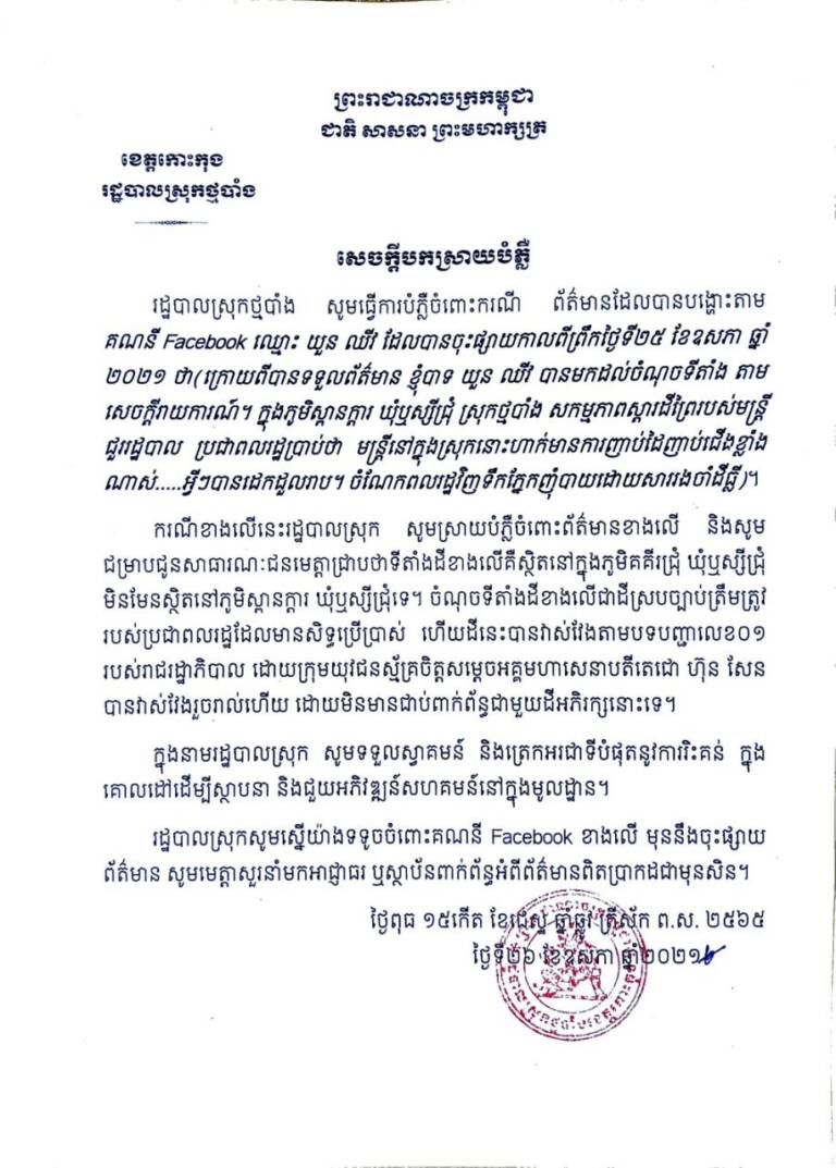 សេចក្តីស្រាយបំភ្លឺរបស់រដ្ឋបាលស្រុកថ្មបាំង