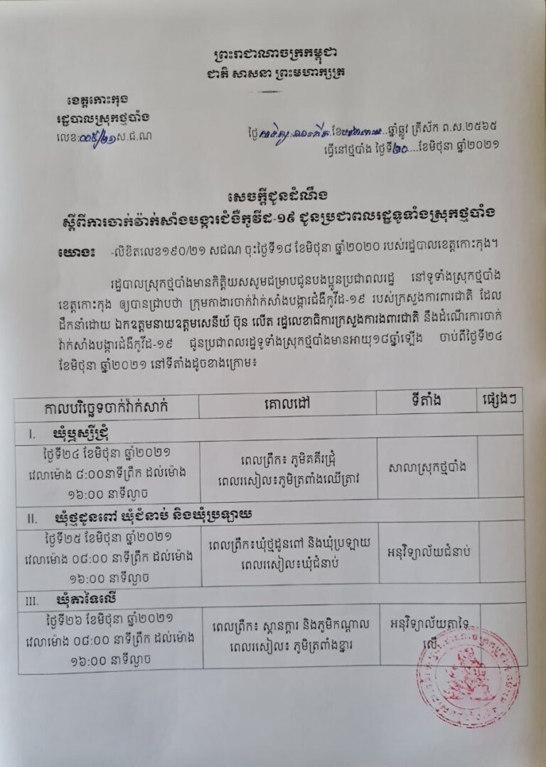 សកម្មភាពក្រុមការងារចាក់វ៉ាក់សាំងបង្ការជំងឺកូវីដ១៩ SINOVAC របស់ក្រសួងការពារជាតិ ជូនប្រជាពលរដ្ឋឃុំឬស្សីជ្រុំស្រុកថ្មបាំង