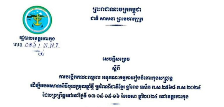 សេចក្តីសម្រេច ស្តីពីការបង្កើតគណៈកម្មការ អនុគណៈកម្មការរៀបចំកោះកុងសង្ក្រាន្ត ដើម្បីអបអរសាទរពិធីបុណ្យចូលឆ្នាំថ្មី ប្រពៃណីជាតិខ្មែរ ឆ្នាំរោង ឆស័ក ព.ស.២៥៦៨ គ.ស.២០២៤ ដែលប្រព្រឹត្តទៅនៅថ្ងៃទី ១៣-១៤-១៥-១៦ ខែមេសា ឆ្នាំ២០២៤ នៅខេត្តកោះកុង