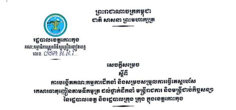 សេចក្តីសម្រេច ស្តីពីការកែសម្រួលសមាសភាពគណៈកម្មាធិការប្រយុទ្ធនឹងជំងឺអេដស៍ខេត្តកោះកុង