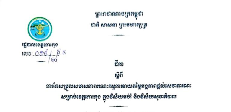ដីកា ស្តីពីការកែសម្រួលសមាសភាពគណៈកម្មការវាយតម្លៃអង្គភាពផ្តល់សេវាធារណៈ សម្រាប់ខេត្តកោះកុង ក្នុងវិស័យអប់រំ និងវិស័យសុខាភិបាល