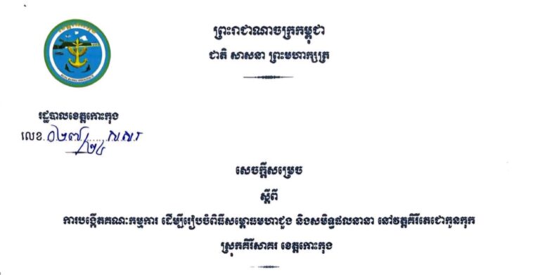 សេចក្តីសម្រេច ស្តីពីការបង្កើតគណៈកម្មការ ដើម្បីរៀបចំពិធីសម្ពោធមហាដួង និងសមិទ្ធផលនានា នៅវត្តគិរីតេជោកូនកុក ស្រុកគិរីសាគរ ខេត្តកោះកុង