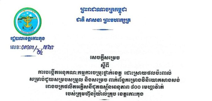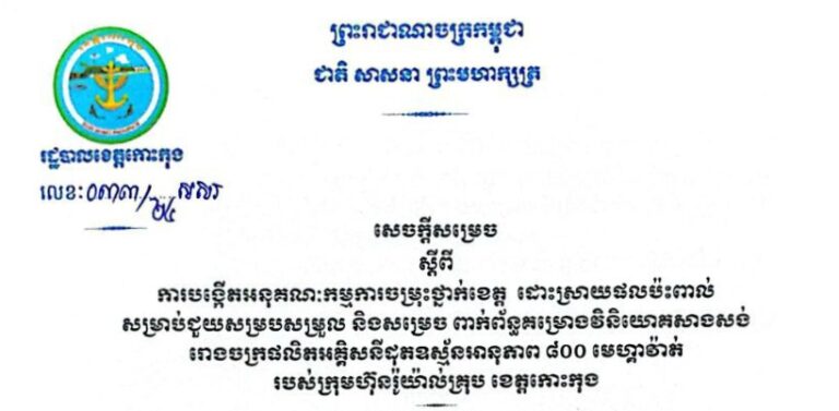 សេចក្តីសម្រេច ស្តីពីការបង្កើតអនុគណៈកម្មការចម្រុះថ្នាក់ខេត្ត ដោះស្រាយផលប៉ះពាល់ សម្រាប់ជួយសម្របសម្រួល និងសម្រេចពាក់ព័ន្ធគម្រោងវិនិយោគសាងសង់ រោងចក្រផលិតអគ្គិសនីដុតឧស្ម័នអានុភាព ៨០០ មេហ្គាវ៉ាត់ របស់ក្រុមហ៊ុនរ៉ូយ៉ាល់គ្រុប ខេត្តកោះកុង