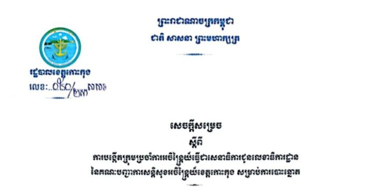សេចក្តីសម្រេច ស្តីពីការកែសម្រួលសមាសភាពគណៈកម្មការដឹកនាំហិរញ្ញប្បទានសុខាភិបាលខេត្តកោះកុង