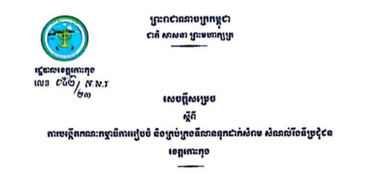 សេចក្តីសម្រេច ស្តីពីការបង្កើតគណៈកម្មាធិការរៀបចំ និងគ្រប់គ្រងទីលានទុកដាក់សំរាម សំណល់រឹងទីប្រជុំជន ខេត្តកោះកុង