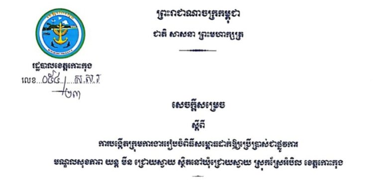 សេចក្តីសម្រេច ស្តីពីការបង្កើតក្រុមការងាររៀបចំពិធីសម្ពោធដាក់ឱ្យប្រើប្រាស់ជាផ្លូវការមណ្ឌលសុខភាព យន្ត មីន ជ្រោយស្វាយ ស្ថិតនៅឃុំជ្រោយស្វាយ ស្រុកស្រែអំបិល ខេត្តកោះកុង