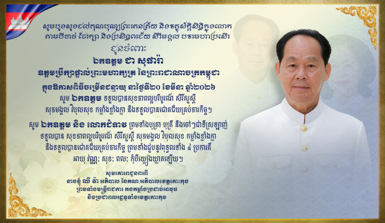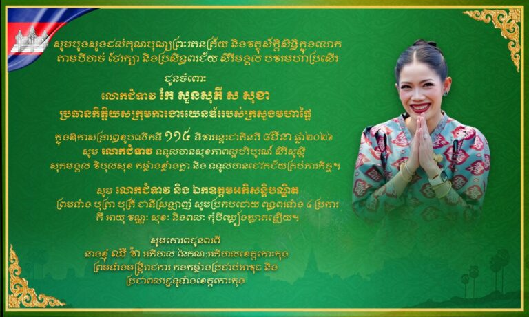 សារលិខិតជូនពរ ជូនចំពោះលោកជំទាវ ឈី វ៉ា អភិបាល នៃគណៈអភិបាលខេត្តកោះកុង ក្នុងឱកាសប្រារព្ធខួបលើកទី ១១៥ ទិវាអន្តរជាតិនារី ៨មីនា ឆ្នាំ២០២៦ សូមគោរពជូនពរពី លោកនាយករដ្ឋបាល សាលាខេត្តកោះកុង និងមន្ត្រីក្រោមឱវាទ