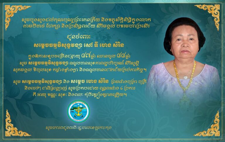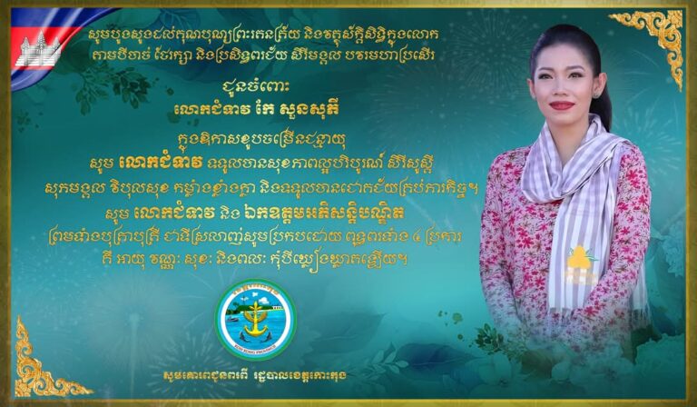 សូមគោរពជូនពរ ជូនចំពោះ លោកជំទាវ កែ សួនសុភី ក្នុងពិធីចម្រើនជន្មាយុ សូមលោកជំទាវ និងក្រុមគ្រួសារ ព្រមទាំងបុត្រា បុត្រីជាទីស្រលាញ់ សូមទទួលបាននូវសុខភាពល្អបរិបូរណ៍ និងសម្រេចបាននូវជោគជ័យលើគ្រប់ភារកិច្ច និងសូមបានប្រកបដោយពុទ្ធពរទាំង ៤ប្រការគឺ អាយុ វណ្ណៈ សុខៈ ពលៈ កុំបីឃ្លៀងឃ្លាតឡើយ