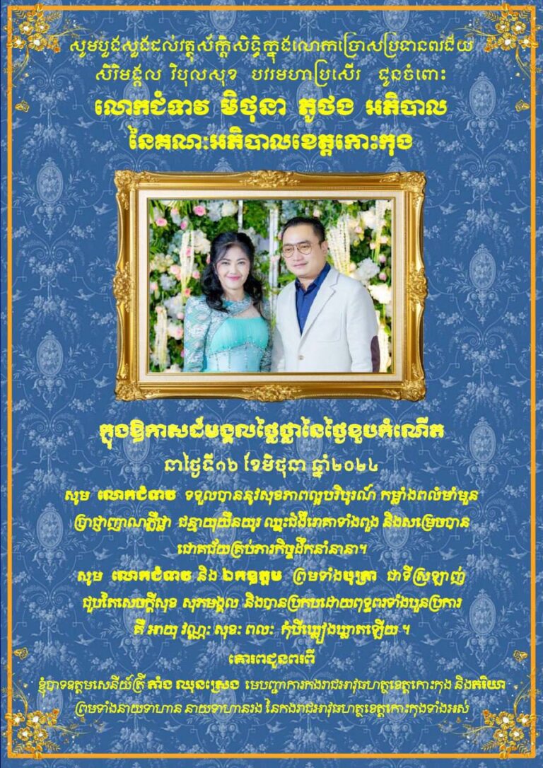សូមគោរពជូនពរ ចំពោះលោកជំទាវ មិថុនា ភូថង អភិបាល នៃគណៈអភិបាលខេត្តកោះកុង ក្នុងថ្ងៃខួបកំណើត ដែលនឹងឈានចូលមកដល់នៅថ្ងៃទី១៦ ខែមិថុនា ឆ្នាំ២០២៤ សូមគោរពជូនពរពី ថ្នាក់ដឹកនាំខេត្ត និងមន្ត្រីសាលាខេត្តកោះកុងទាំងអស់