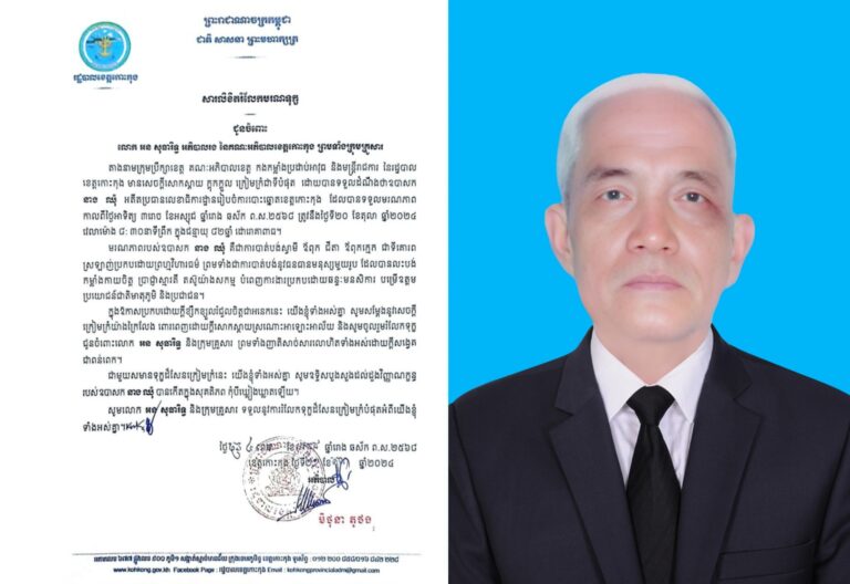 សារលិខិតរំលែកមរណទុក្ខ ជូនចំពោះលោក អន សុធារិទ្ធ អភិបាលរង នៃគណៈអភិបាលខេត្តកោះកុង ព្រមទាំងក្រុមគ្រួសារ