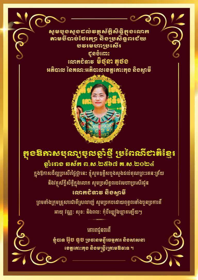 អបអរសាទរ ពិធីបុណ្យចូលឆ្នាំថ្មីប្រពៃណីជាតិខ្មែរ ក្នុងឱកាសដ៏វិសេសវិសាលនៃពិធីបុណ្យចូលឆ្នាំថ្មី ប្រពៃណីជាតិខ្មែរ ឆ្នាំ រោង ឆស័ក ពុទ្ធសករាជ ២៥៦៨ គ្រិស្តសករាជ ២០២៤ នាងខ្ញុំ មិថុនា ភូថង អភិបាល នៃគណៈអភិបាលខេត្តកោះកុង និងស្វាមី ផាន់ កណ្ណារ៉ាត សូមគោរពជូនពរសព្ទសាធុការពរចំពោះ សម្តេច ទ្រង់ ឯកឧត្តម លោកជំទាវ លោកឧកញ៉ា អ្នកឧកញ៉ា ឧកញ៉ា លោក លោកស្រី និងប្រជាពលរដ្ឋទាំងអស់ សូមទទួលបានពរជ័យ សិរីមង្គល វិបុលសុខមហាប្រសើរ ជោគជ័យ គ្រប់ការកិច្ច និងសូមឱ្យគ្រោះឆ្នាំចាស់ វិនាសសាបសូន្យ ទទួលលាភជ័យក្នុងឆ្នាំថ្មី ជាពិសេស សូមជៀសផុតពីជំងឺកាចសាហាវទាំងឡាយ