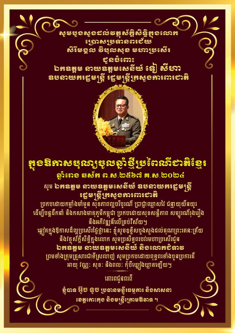សូមបួងសួងដល់វត្ថុស័ក្តិសិទ្ធិក្នុងលោក ប្រោសប្រទានពរជ័យ សិរីមង្គល វិបុលសុខ មហាប្រសើរ ជូនចំពោះ ឯកឧត្តម នាយឧត្តមសេនីយ៍ ទៀ សីហា ឧបនាយករដ្ឋមន្ត្រី រដ្ឋមន្ត្រីក្រសួងការពារជាតិ ក្នុងឱកាសបុណ្យចូលឆ្នាំថ្មីប្រពៃណីជាតិខ្មែរ ឆ្នាំរោង ឆស័ក ព.ស.២៥៦៧ គ.ស.២០២៤ គោរពជូនពរពី ខ្ញុំបាទ អ៊ូច ទូច ប្រធានមន្ទីរធម្មការ និងសាសនា ខេត្តកោះកុង និងមន្ត្រីក្រោមឱវាទ