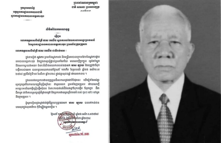 សារលិខិតរំលែកមរណទុក្ខ ផ្ញើជូនលោកឧត្តមសេនីយ៍ត្រី មាស អេលីន ស្នងការរង ផែនការងារអន្តោប្រវេសន៍ នៃស្នងការដ្ឋាននគរបាលខេត្តកោះកុង ដែលឪពុកបង្កើតរបស់លោក បានទទួលមរណភាព ដោយយរោគាពាធ