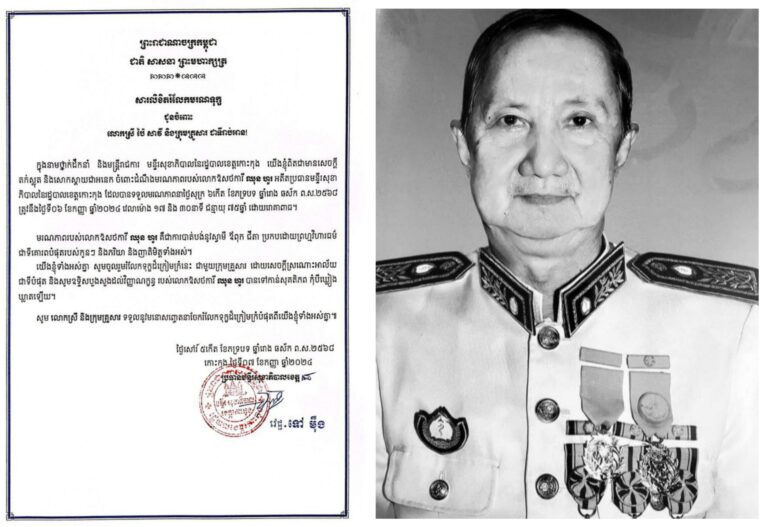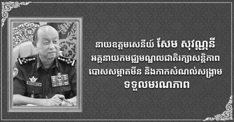 រដ្ឋបាលខេត្តកោះកុង សូមចូលរួមរំលែកទុក្ខនាយឧត្តមសេនីយ៍ សែម សុវណ្ណនី អនុប្រធានទី១ នៃគណៈកម្មាធិការជាតិ និងជាអគ្គនាយកមជ្ឈមណ្ឌលជាតិរក្សាសន្តិភាព បានទទួលមរណភាព នៅមន្ទីរពេទ្យសាន់រ៉ាយភ្នំពេញ នាវេលាម៉ោង ០៦នាទីល្ងាច ថ្ងៃទី៨ ខែតុលា ឆ្នាំ២០២៤នេះ ក្នុងជន្មាយុ៦៥ឆ្នាំ ដោយរោគាពាធ