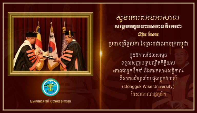 សូមគោរពអបអរសាទរ សម្តេចអគ្គមហាសេនាបតីតេជោ ហ៊ុន សែន ប្រធានព្រឹទ្ធសភា នៃព្រះរាជាណាចក្រកម្ពុជា ក្នុងឱកាសដែលសម្តេច ទទួលសញ្ញាបត្របណ្ឌិតកិត្តិយស «ភាពជាអ្នកដឹកនាំ និងការកសាងសន្តិភាព» ពីសាកលវិទ្យាល័យ ដុងហ្គុកវាយស៍ ( Dongguk Wise University ) នៃសាធារណរដ្ឋកូរ៉េ