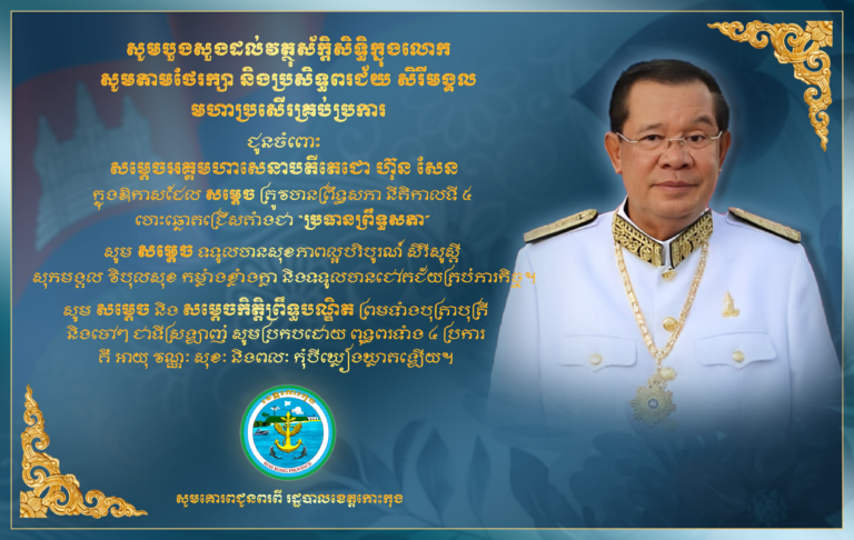 សូមបួងសួងដល់វត្ថុស័ក្តិសិទ្ធិក្នុងលោក សូមតាមថែរក្សា និងប្រសិទ្ធពរជ័យ សិរីមង្គល មហាប្រសើរគ្រប់ប្រការ ជូនចំពោះ សម្តេចអគ្គមហាសេនាបតីតេជោ ហ៊ុន សែន ក្នុងឱកាសដែល សម្តេច ត្រូវបានព្រឹទ្ធសភា នីតិកាលទី ៥ បោះឆ្នោតជ្រើសតាំងជា “ប្រធានព្រឹទ្ធសភា”។ សូមគោរពជូនពរពី រដ្ឋបាលខេត្តកោះកុង