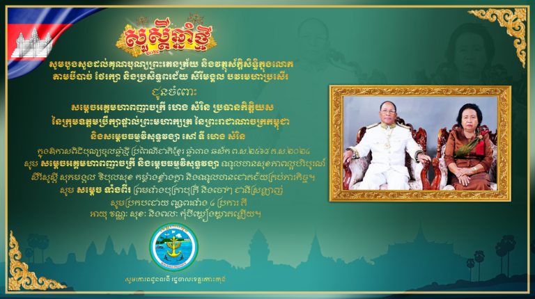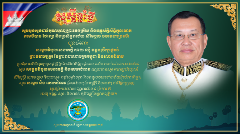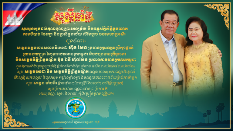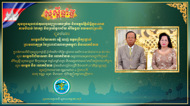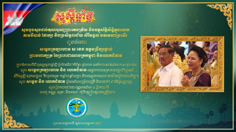 សូមបួងសួងដល់គុណបុណ្យព្រះរតនត្រ័យ និងវត្ថុស័ក្តិសិទ្ធិក្នុងលោក តាមបីបាច់ ថែរក្សា និងប្រសិទ្ធពរជ័យ សិរីមង្គល បវរមហាប្រសើរជូនចំពោះសម្តេចអគ្គមហាសេនាបតីតេជោ ហ៊ុន សែន ប្រធានក្រុមឧត្តមប្រឹក្សាផ្ទាល់ ព្រះមហាក្សត្រ នៃព្រះរាជាណាចក្រកម្ពុជា និងជាប្រធានព្រឹទ្ធសភា និងសម្តេចកិត្តិព្រឹទ្ធបណ្ឌិត ប៊ុន រ៉ានី ហ៊ុនសែន ប្រធានកាកបាទក្រហមកម្ពុជា ក្នុងឱកាសពិធីបុណ្យចូលឆ្នាំថ្មី ប្រពៃណីជាតិខ្មែរ ឆ្នាំរោង ឆស័ក ព.ស.២៤៦៨ គ.ស.២០២៤ សូមគោរពជូនពរពី រដ្ឋបាលខេត្តកោះកុង