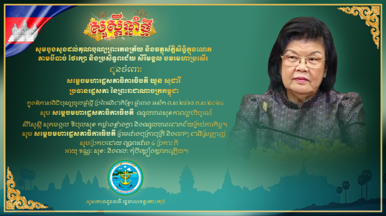 សូមបួងសួងដល់គុណបុណ្យព្រះរតនត្រ័យ និងវត្ថុស័ក្តិសិទ្ធិក្នុងលោក តាមបីបាច់ ថែរក្សា និងប្រសិទ្ធពរជ័យ សិរីមង្គល បវរមហាប្រសើរ ជូនចំពោះសម្តេចមហារដ្ឋសភាធិការធិបតី ឃួន សុដារី ប្រធានរដ្ឋសភា នៃព្រះរាជាណាចក្រកម្ពុជា ក្នុងឱកាសពិធីបុណ្យចូលឆ្នាំថ្មី ប្រពៃណីជាតិខ្មែរ ឆ្នាំរោង ឆស័ក ព.ស.២៤៦៨ គ.ស.២០២៤ សូមគោរពជូនពរពី រដ្ឋបាលខេត្តកោះកុង