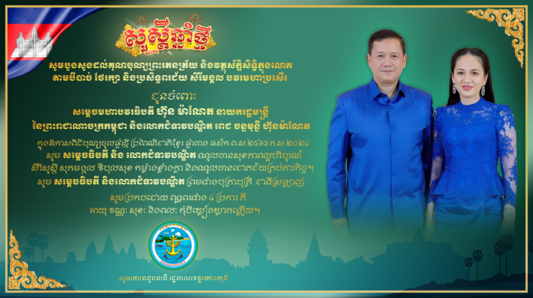សូមបួងសួងដល់គុណបុណ្យព្រះរតនត្រ័យ និងវត្ថុស័ក្តិសិទ្ធិក្នុងលោក តាមបីបាច់ ថែរក្សា និងប្រសិទ្ធពរជ័យ សិរីមង្គល បវរមហាប្រសើរ ជូនចំពោះសម្តេចមហាបវរធិបតី ហ៊ុន ម៉ាណែត នាយករដ្ឋមន្ត្រី នៃព្រះរាជាណាចក្រកម្ពុជា និងលោកជំទាវបណ្ឌិត ពេជ ចន្ទមុន្នី ហ៊ុនម៉ាណែត ក្នុងឱកាសពិធីបុណ្យចូលឆ្នាំថ្មី ប្រពៃណីជាតិខ្មែរ ឆ្នាំរោង ឆស័ក ព.ស.២៤៦៨ គ.ស.២០២៤ សូមគោរពជូនពរពី រដ្ឋបាលខេត្តកោះកុង