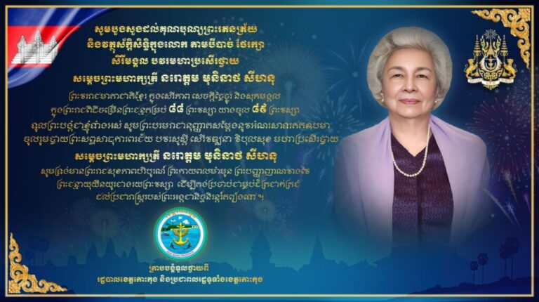 សារលិខិតថ្វាយព្រះពរ សូមក្រាបបង្គំទូលថ្វាយ សម្តេចព្រះ មហាក្សត្រី នរោត្តម មុនិនាថ សីហនុ ព្រះវររាជមាតាជាតិខ្មែរ ក្នុងសេរីភាព សេចក្តីថ្លៃថ្នូរ និងសុភមង្គល ក្នុងឱកាស នៃព្រះរាជពិធីបុណ្យចម្រើនព្រះជន្ម សម្តេចព្រះមហាក្សត្រី ព្រះវររាជមាតាជាតិខ្មែរ ជាទីគោរពសក្ការៈដ៏ខ្ពង់ខ្ពស់បំផុត គម្រប់ព្រះជន្ម ៨៨ យាងចូល ៨៩ព្រះវស្សា