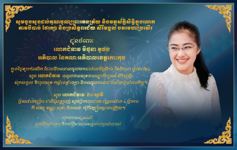 សូមគោរពជូនពរ ចំពោះលោកជំទាវ មិថុនា ភូថង អភិបាល នៃគណៈអភិបាលខេត្តកោះកុង ក្នុងថ្ងៃខួបកំណើត ដែលនឹងឈានចូលមកដល់នៅថ្ងៃទី១៦ ខែមិថុនា ឆ្នាំ២០២៤ សូមគោរពជូនពរពី ថ្នាក់ដឹកនាំខេត្ត និងមន្ត្រីសាលាខេត្តកោះកុងទាំងអស់