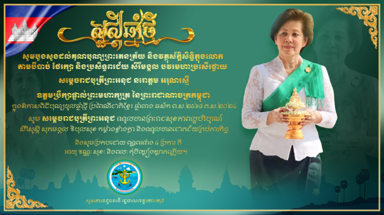 សូមបួងសួងដល់គុណបុណ្យព្រះរតនត្រ័យ និងវត្ថុស័ក្តិសិទ្ធិក្នុងលោកតាមបីបាច់ ថែរក្សា និងប្រសិទ្ធពរជ័យ សិរីមង្គល បវរមហាប្រសើរថ្វាយសម្តេចរាជបុត្រីព្រះអនុជ នរោត្តម អរុណរស្មី ឧត្តមប្រឹក្សាផ្ទាល់ព្រះមហាក្សត្រ នៃព្រះរាជាណាចក្រកម្ពុជា ក្នុងឱកាសពិធីបុណ្យចូលឆ្នាំថ្មី ប្រពៃណីជាតិខ្មែរ ឆ្នាំរោង ឆស័ក ព.ស.២៤៦៨ គ.ស.២០២៤ សូមគោរពជូនពរពី រដ្ឋបាលខេត្តកោះកុង