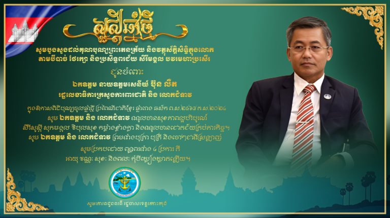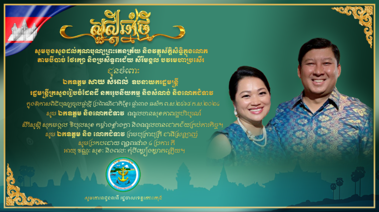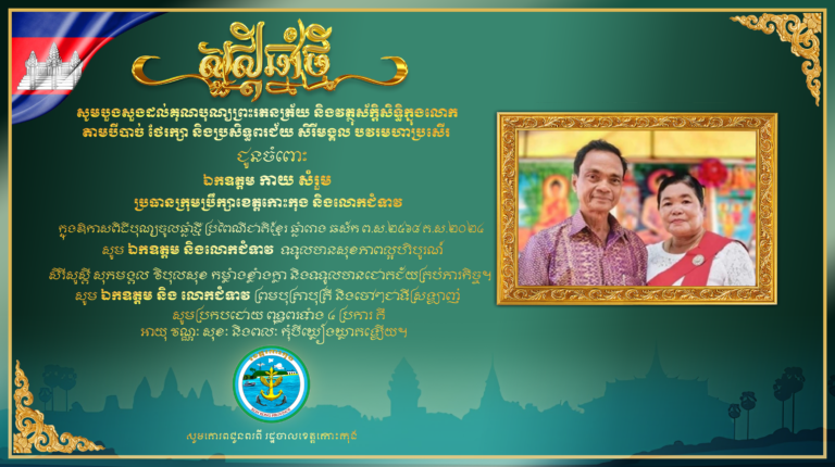 សូមបួងសួងដល់គុណបុណ្យព្រះរតនត្រ័យ និងវត្ថុស័ក្តិសិទ្ធិក្នុងលោក តាមបីបាច់ ថែរក្សា និងប្រសិទ្ធពរជ័យ សិរីមង្គល បវរមហាប្រសើរ ជូនចំពោះ ឯកឧត្តម កាយ សំរួម ប្រធានក្រុមប្រឹក្សាខេត្តកោះកុង និងលោកជំទាវ ក្នុងឱកាសពិធីបុណ្យចូលឆ្នាំថ្មី ប្រពៃណីជាតិខ្មែរ ឆ្នាំរោង ឆស័ក ព.ស.២៤៦៨ គ.ស.២០២៤ សូមគោរពជូនពរពី រដ្ឋបាលខេត្តកោះកុង