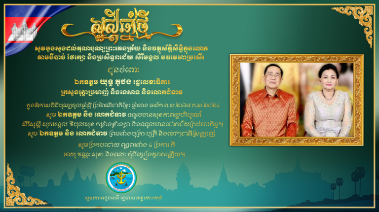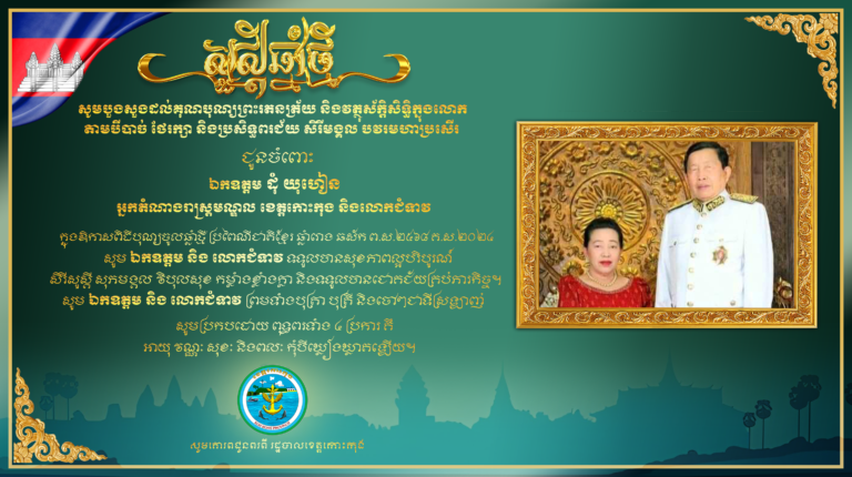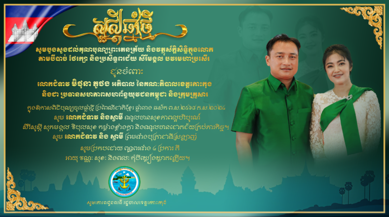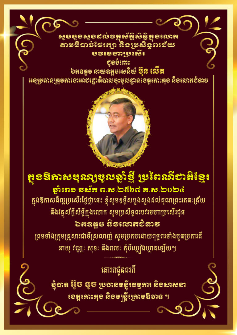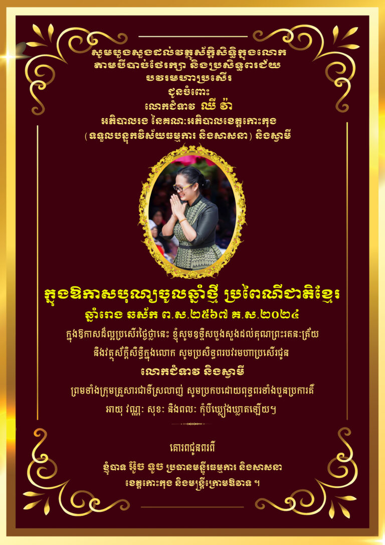 សូមបួងសួងដល់គុណបុណ្យព្រះរតនត្រ័យ និងវត្ថុស័ក្តិសិទ្ធិក្នុងលោក តាមបីបាច់ ថែរក្សា និងប្រសិទ្ធពរជ័យ សិរីមង្គល បវរមហាប្រសើត ជូនចំពោះ លោកជំទាវ មិថុនា ភូថង អភិបាល នៃគណៈភិបាលខេត្តកោះកុង និងជាប្រធានសហភាពសហព័ន្ធយុវជនកម្ពុជា និងក្រុមគ្រួសារ ក្នុងឱកាសពិធីបុណ្យចូលឆ្នាំថ្មី ប្រពៃណីជាតិខ្មែរ ឆ្នាំរោង ឆស័ក ព.ស.២៤៦៨ គ.ស.២០២៤ សូមគោរពជូនពរពី រដ្ឋបាលខេត្តកោះកុង
