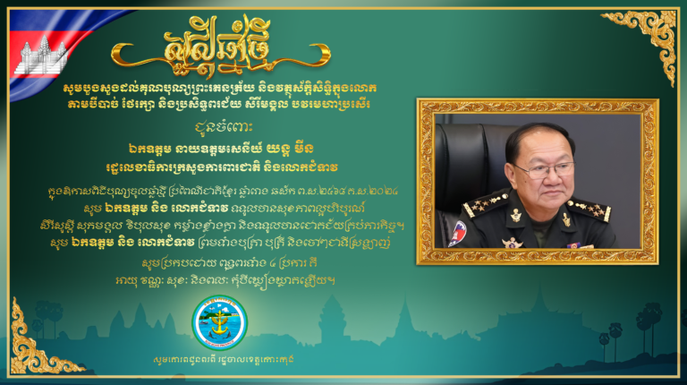 សូមបួងសួងដល់គុណបុណ្យព្រះរតនត្រ័យ និងវត្ថុស័ក្តិសិទ្ធិក្នុងលោក តាមបីបាច់ ថែរក្សា និងប្រសិទ្ធពរជ័យ សិរីមង្គល បវរមហាប្រសើរ ជូនចំពោះ ឯកឧត្តមនាយឧត្តមសេនីយ៍ យន្ត មីន រដ្ឋលេខាធិការ ក្រសួងការពារជាតិ និងលោកជំទាវ ក្នុងឱកាសពិធីបុណ្យចូលឆ្នាំថ្មី ប្រពៃណីជាតិខ្មែរ ឆ្នាំរោង ឆស័ក ព.ស.២៤៦៨ គ.ស.២០២៤ សូមគោរពជូនពរពី រដ្ឋបាលខេត្តកោះកុង
