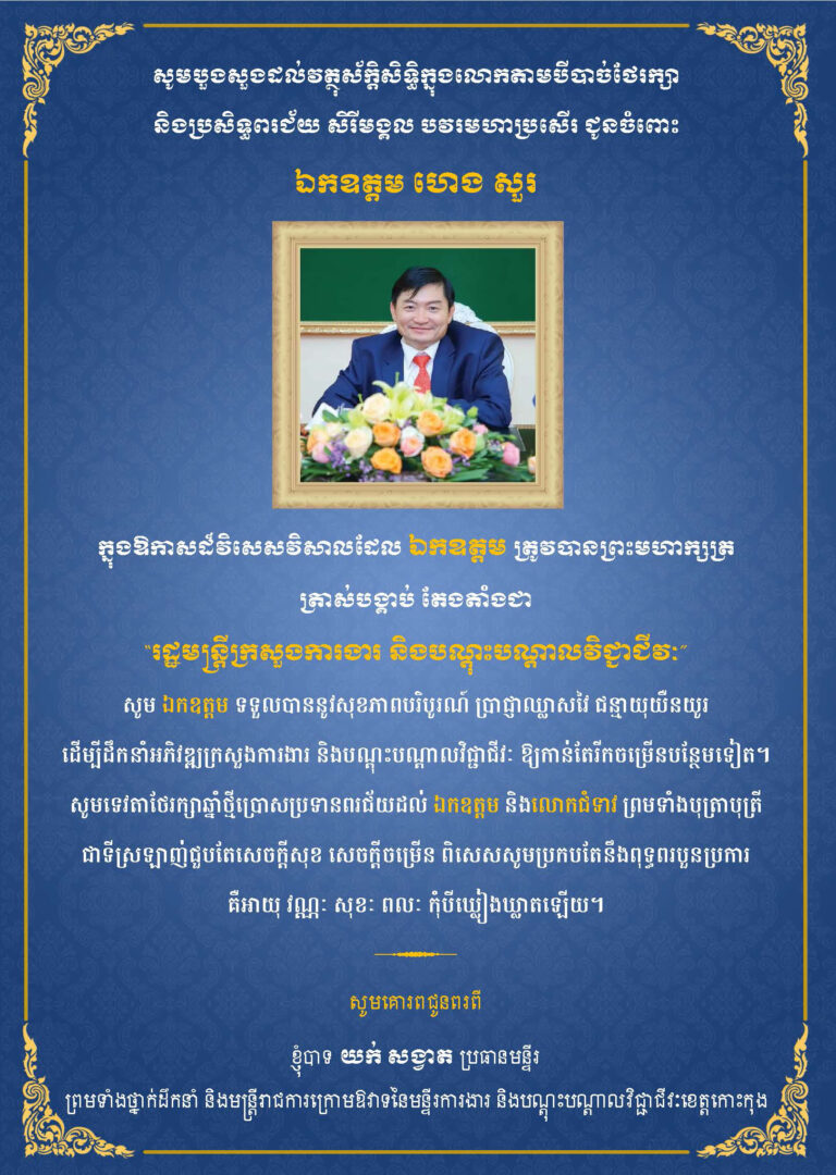 សារលិខិតជូនពរ ឯកឧត្តម ហេង សួរ ចូលកាន់តំណែងជា រដ្ឋមន្ត្រីក្រសួងការងារ និងបណ្ដុះបណ្ដាលវិជ្ជាជីវ: