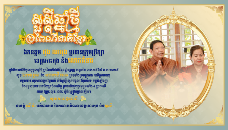 សូមគោរពជូនពរ ឯកឧត្តម ថុង ណារុង ប្រធានក្រុមប្រឹក្សាខេត្តកោះកុង និងលោកជំទាវ ក្នុងឱកាសពិធីបុណ្យចូលឆ្នាំថ្មី ប្រពៃណីជាតិខ្មែរ ឆ្នាំម្សាញ់ សប្តស័ក ព.ស.២៥៦៩ គ.ស.២០២៥ សូមគោរពជូនពរពីនាងខ្ញុំ ឈី វ៉ា អភិបាលរង នៃគណៈអភិបាលខេត្តកោះកុង និងស្វាមី