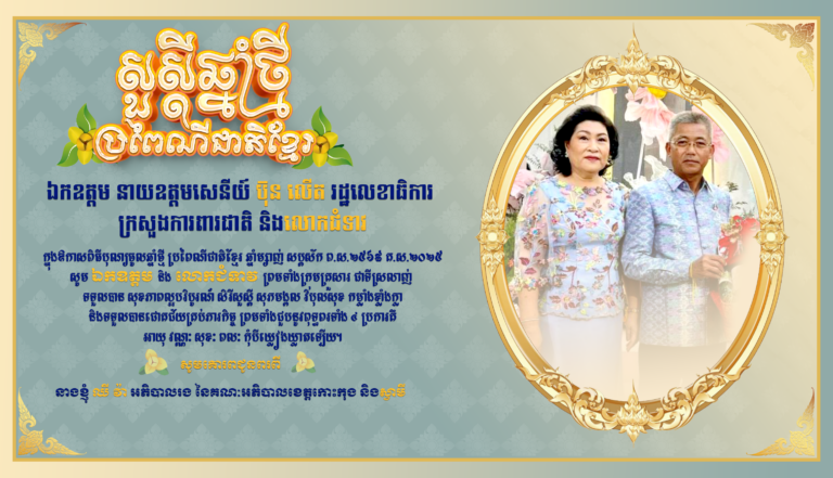 សូមគោរពជូនពរ ឯកឧត្តម នាយឧត្តមសេនីយ៍ ប៊ុន លើត រដ្ឋលេខាធិការ ក្រសួងការពារជាតិ និងលោកជំទាវ ក្នុងឱកាសពិធីបុណ្យចូលឆ្នាំថ្មី ប្រពៃណីជាតិខ្មែរ ឆ្នាំម្សាញ់ សប្តស័ក ព.ស.២៥៦៩ គ.ស.២០២៥ សូមគោរពជូនពរពីនាងខ្ញុំ ឈី វ៉ា អភិបាលរង នៃគណៈអភិបាលខេត្តកោះកុង និងស្វាមី