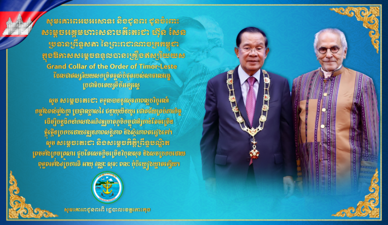 សូមគោរពអបអរសាទរ និងជូនពរជូនចំពោះ សម្តេចអគ្គមហាសេនាបតីតេជោ ហ៊ុន សែន ប្រធានព្រឹទ្ធសភា នៃព្រះរាជាណាចក្រកម្ពុជា ក្នុងឱកាសសម្តេចទទួលបានគ្រឿងឥស្សរិយយស Grand Collar of the Order of Timor-Leste ដែលជាឥស្សរិយយសកម្រិតខ្ពស់បំផុតរបស់សាធាណរដ្ឋ ប្រជាធិបតេយ្យទីម័រឡេស្តេ