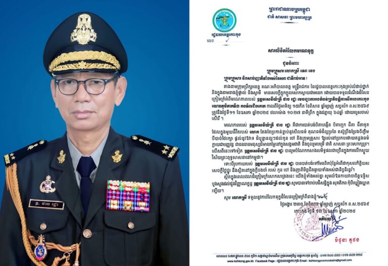 សារលិខិតរំលែកមរណទុក្ខ ជូនចំពោះ ក្រុមគ្រួសារ លោកស្រី ទេព ខេង និងសាច់ញាតិទាំងអស់នៃសពរបស់ ឧត្តមសេនីយ៍ត្រី ថាច រដ្ឋា មេបញ្ជាការរងតំបន់ប្រតិបត្តិការសឹករងកោះកុង យោធភូមិភាគទី៣ កងទ័ពជើងគោក