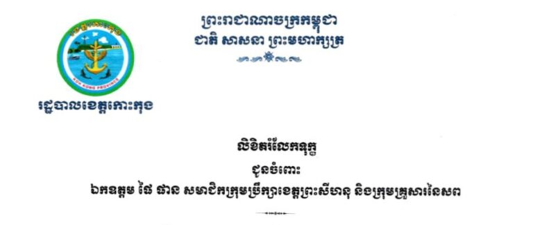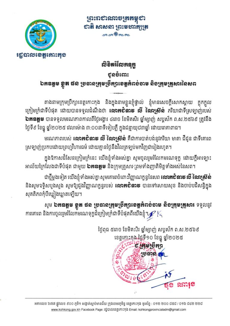 ក្រុមប្រឹក្សាខេត្តកោះកុង សូមផ្ញើសាររំលែកទុក្ខ ជូនចំពោះឯកឧត្តម ផៃ ផាន សមាជិកក្រុមប្រឹក្សាខេត្តព្រះសីហនុ ដែលភរិយាឯកឧត្តម ទទួលមរណភាពកាលពីថ្ងៃទី២៥ តុលា ឆ្នាំ២០២៥