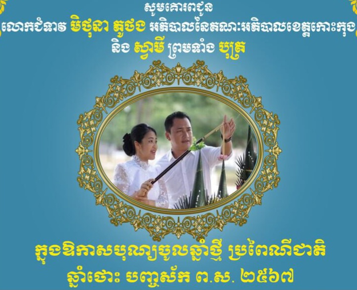 លោកជំទាវ មិថុនា ភូថង អភិបាល នៃគណៈអភិបាលខេត្តកោះកុង និងក្រុមគ្រួសារ សូមគោរពជូនពរ ឯកឧត្តម ដុំ យុហៀន តំណាងរាស្ត្រមណ្ឌលខេត្តកោះកុង និងលោកជំទាវ ក្នុងឱកាសពិធីបុណ្យចូលឆ្នំាថ្មី ប្រពៃណីជាតិខ្មែរ ឆ្នាំថោះ បញ្ចស័ក ព.ស.២៤៦៧ គ.ស.២០២៣