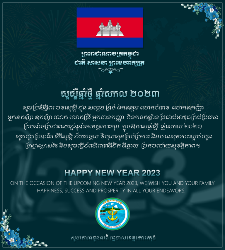 សារជូនពរ សូមគោរពជូន ឯកឧត្តម ហ៊ុន ម៉ាណែត អគ្គមេបញ្ជាការរង នៃកងយោធពលខេមរភូមិន្ទ មេបញ្ជាការកងទ័ពជើងគោក និងលោកជំទាវ ក្នុងឱកាសបុណ្យចូលឆ្នាំថ្មី ឆ្នាំសកល២០២៣ សូមគោរពជូនពរពី រដ្ឋបាលខេត្តកោះកុង