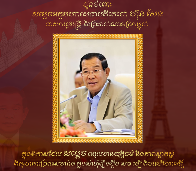 រដ្ឋបាលខេត្តកោះកុង សូមគោរពជូនពរ និងអបអរសាទរសម្តេចតេជោ ហ៊ុន សែន នាយករដ្ឋមន្ត្រី នៃព្រះរាជាណាចក្រកម្ពុជា ដែលទទួលបានយុត្តិធម៌ និងភាពស្អាតស្អំ ពីតុលាការប្រទេសបារាំង ក្នុងសំណុំរឿងប្តឹង សម រង្ស៊ី ពីបទបរិហាកេរ្តិ៍