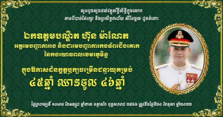 រដ្ឋបាលខេត្តកោះកុង ផ្ញើសារគោរព ជូនពរឯកឧត្តមបណ្ឌិត ហ៊ុន ម៉ាណែត អគ្គមេបញ្ជាការរង និងមេបញ្ជាការកងទ័ពជើងគោក នៃកងយោធពលខេមរភូមិន្ទ ក្នុងឱកាសពិធីចម្រើនជន្មាយុគម្រប់ ៤៥ឆ្នាំ ឈានចូល ៤៦ឆ្នាំ