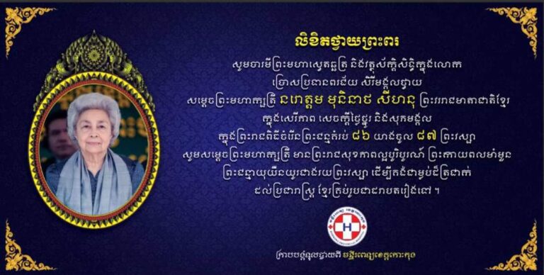 សារថ្វាយព្រះពរ សម្តេចព្រះមហាក្សត្រី នរោត្តម មុនិនាថ សីហនុ ព្រះវររាជមាតាជាតិខ្មែរ ក្នុងសេរីភាព សេចក្តីថ្លៃថ្នូរ និងសុភមង្គល ក្នុងព្រះរាជពិធីចម្រើនព្រះជន្មគម្រប់ ៨៦ យាងចូល ៨៧ ព្រះវស្សា ក្រាបបង្គំទូលថ្វាយ ពីមន្ទីរពេទ្យបង្អែកខេត្តកោះកុង