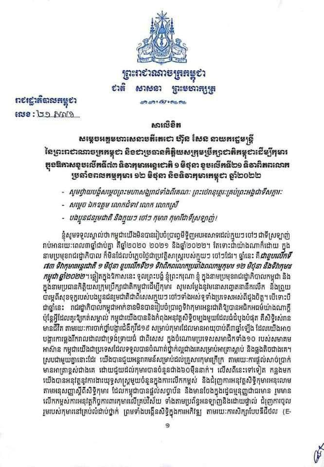 សារលិខិតសម្តេចតេជោ ហ៊ុន សែន នាយករដ្ឋមន្តី នៃព្រះរាជាណាចក្រកម្ពុជា និងជាប្រធានកិត្តិយសក្រុមប្រឹក្សាជាតិកម្ពុជាដើម្បីកុមារ ក្នុងឱកាសខួបលើកទី៧៣ ទិវាកុមារអន្តរជាតិ ១ មិថុនា ខួបលើកទី២១ ទិវាពិភពលោកប្រឆាំងពលកម្មកុមារ ១២ មិថុនា និងទិវាកុមារកម្ពុជា ឆ្នាំ ២០២២