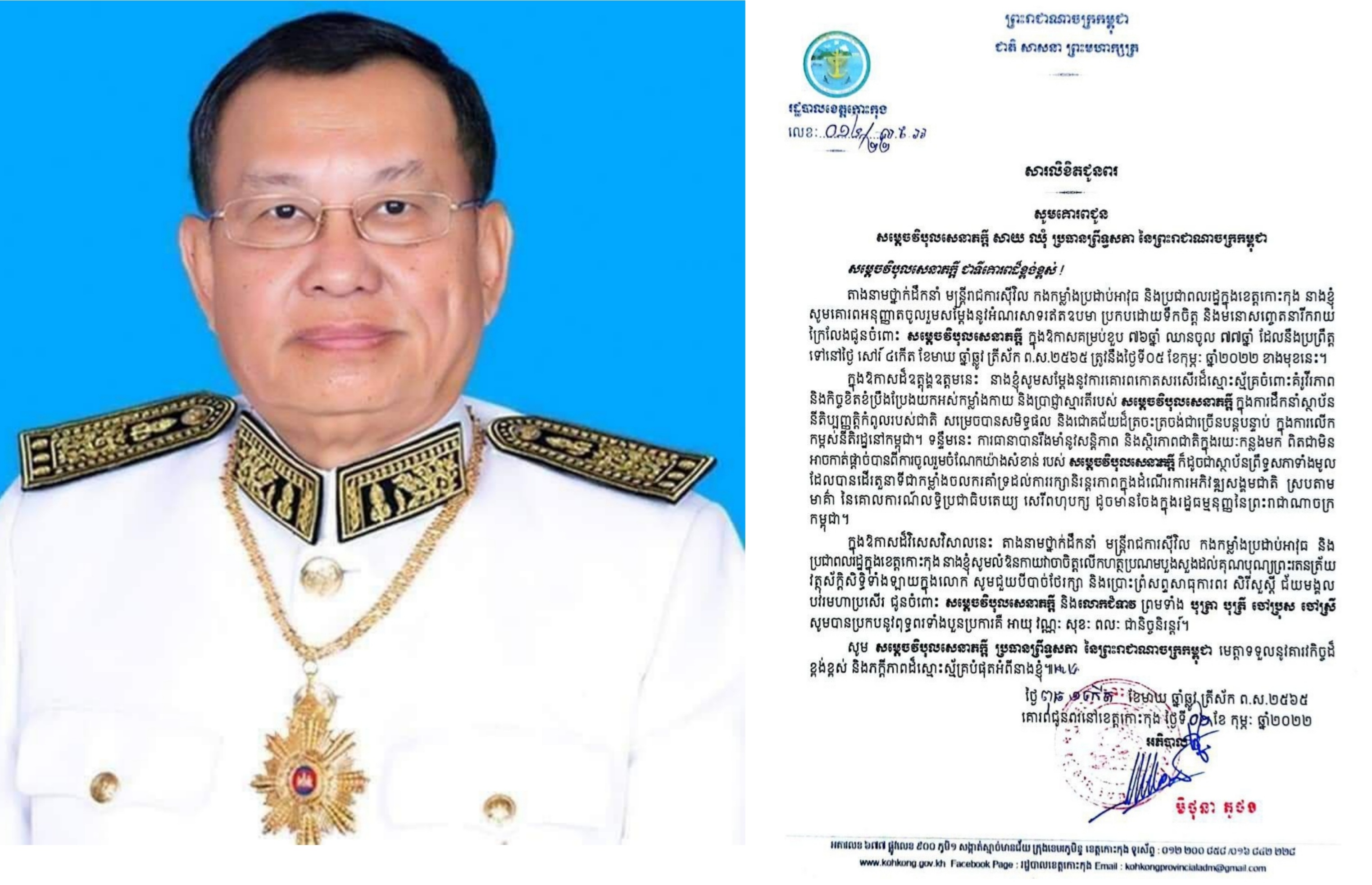 រដ្ឋបាលខេត្តកោះកុង ផ្ញើរសាលិខិតគោរពជូន សម្តេចវិបុលសេនាភក្តី សាយ ឈុំ ប្រធានព្រឹទ្ធសភា នៃព្រះរាជាណាចក្រកម្ពុជា ក្នុងឱកាសគម្រប់ខួប ៧៦ឆ្នាំ ឈានចូល ៧៧ឆ្នាំ ដែលនឹងប្រព្រឹត្តទៅនៅថ្ងៃទី០៥ ខែកុម្ភៈ ឆ្នាំ២០២២ ខាងមុខនេះ