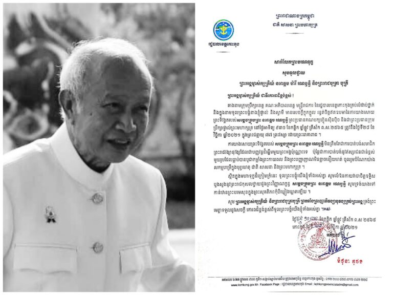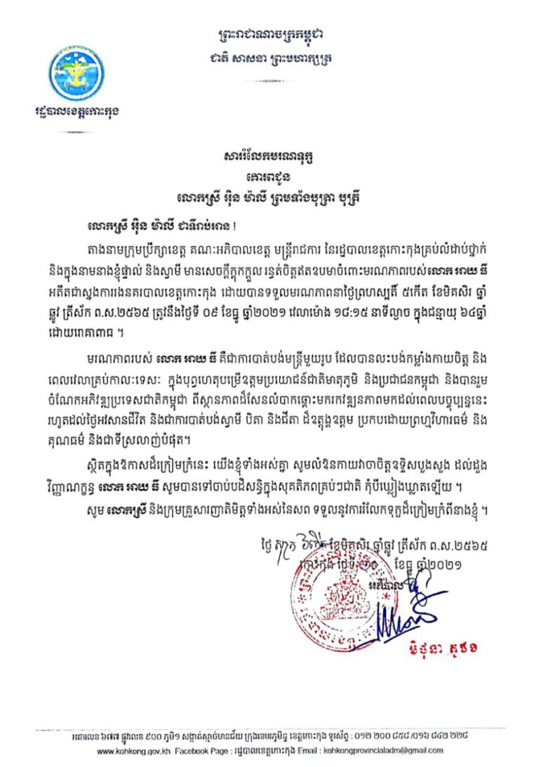 សាររំលែកទុក្ខ សូមទូលថ្វាយ ព្រះអង្គម្ចាស់ក្សត្រិយ៍ នរោត្តម ម៉ារី រណឫទ្ធិ និងព្រះរាជបុត្រា បុត្រី តាងនាមក្រុមប្រឹក្សាខេត្ត គណៈអភិបាលខេត្ត មន្ត្រីរាជការ នៃរដ្ឋបាលខេត្តកោះកុងគ្រប់លំដាប់ថ្នាក់ និងក្នុងនាមទូលព្រះបង្គំនាងខ្ញុំផ្ទាល់ និងស្វាមី មានសេចក្តីក្ដុកក្ដួល រន្ធត់ចិត្តឥតឧបមានៃការយាងសោយ ព្រះទិវង្គតរបស់សម្តេចក្រុមព្រះ នរោត្តម រណឫទ្ធិ ព្រះប្រធានគណបក្សហ៊្វុនស៊ិនប៉ិច និងជាព្រះប្រធានក្រុម ប្រឹក្សាផ្ទាល់ព្រះមហាក្សត្រ នៅថ្ងៃអាទិត្យ ៩រោច ខែកត្តិក ឆ្នាំឆ្លូវ ត្រីស័ក ព.ស.២៥៦៥