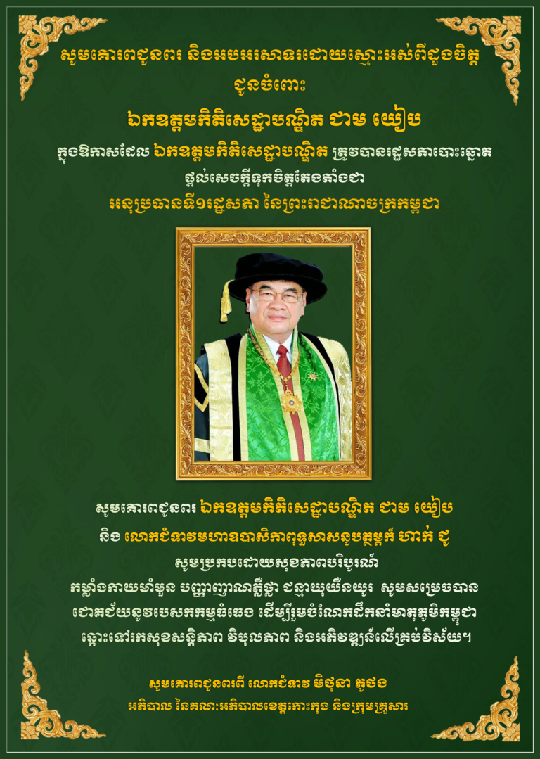 លោកជំទាវ មិថុនា ភូថង អភិបាល នៃគណៈអភិបាលខេត្តកោះកុង និងក្រុមគ្រួសារ សូមគោរពជូនពរ និងអបអរសាទរដោយស្មោះអស់ពីដួងចិត្ត ជូនចំពោះឯកឧត្តមកិតិសេដ្ឋាបណ្ឌិត ជាម យៀប ក្នុងឱកាសដែល ឯកឧត្តមកិតិសេដ្ឋាបណ្ឌិត ត្រូវបានរដ្ឋសភាបោះឆ្នោតតែងតាំង ជាអនុប្រធានទី១ រដ្ឋសភា នៃព្រះរាជាណាចក្រកម្ពុជា