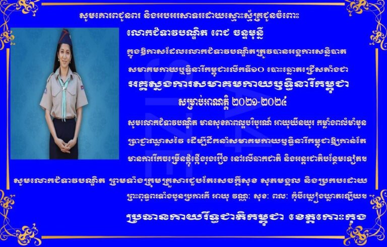 សាខាកាកបាទក្រហមកម្ពុជា ខេត្តកោះកុង គោរពជូនពរចំពោះ សម្ដេចកិត្តិព្រឹទ្ធបណ្ឌិត ប៊ុន រ៉ានី ហ៊ុន សែន ប្រធានបានកាកបាទក្រហមកម្ពុជា នាឱកាសដ៏មហាជ័យមង្គលចម្រើនជន្មាយុគម្រប់ ៦៧ ឈានចូល ៦៨ឆ្នំា សូម សម្តេចកិត្តិព្រឹទ្ធបណ្ឌិត មានសុខភាពល្អបរិបូរណ៍ អាយុយឺនយូរ កម្លាំងខ្លាំងក្លា ដើម្បីបន្តបេសកកម្មដ៏ថ្លៃបម្រើប្រទេសជាតិមាតុភូមិ និងប្រជាជន ឱ្យរីកចម្រើនរុងរឿង