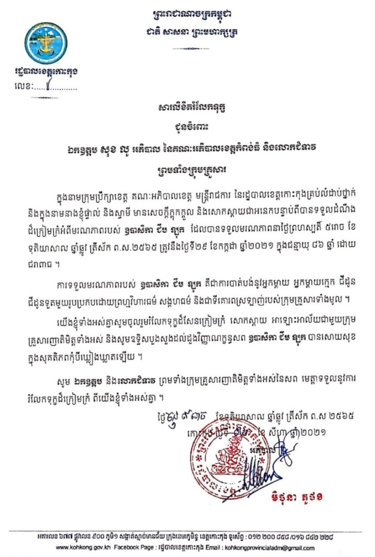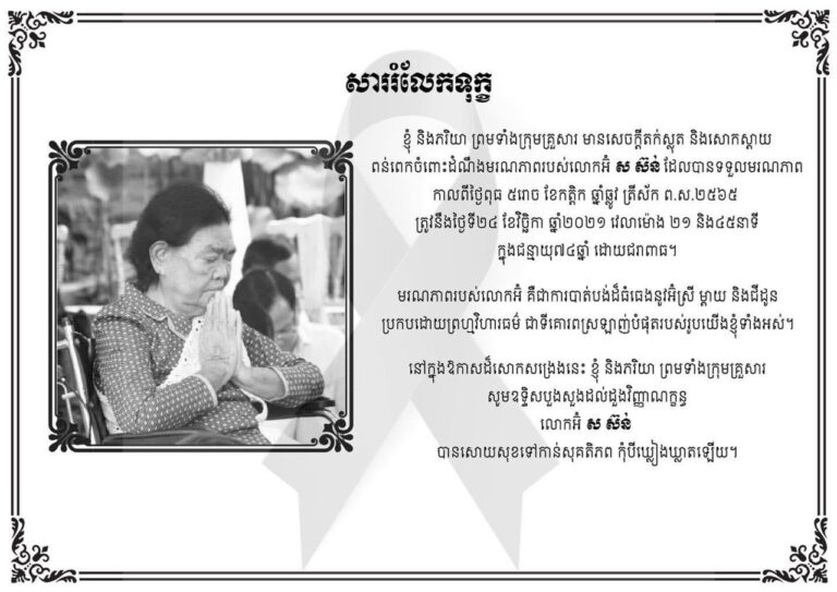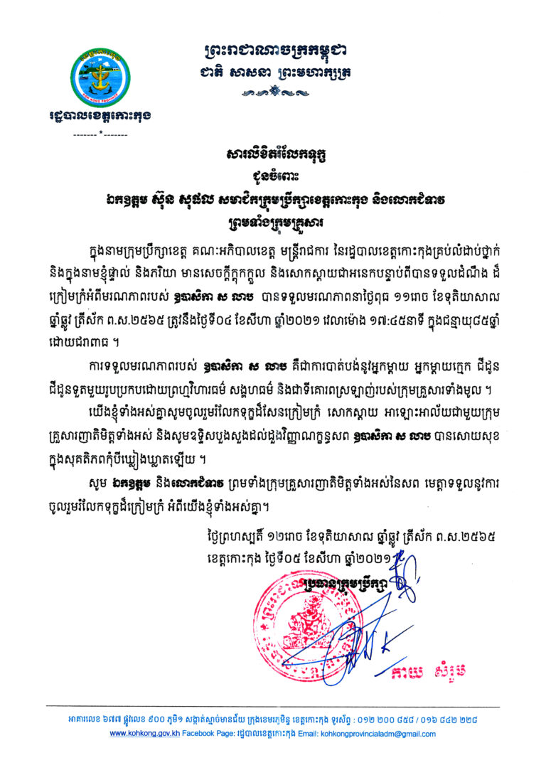 នាងខ្ញុំ និងស្វាមី ព្រមទាំងក្រុមប្រឹក្សាខេត្ត គណៈអភិបាលខេត្ត និងមន្ត្រីរាជការសាលាខេត្តកោះកុង សូមចូលរួមរំលែកទុក្ខដ៏ក្រៀមក្រំចំពោះមរណភាពរបស់លោកអ៊ុំ ស ស៊ន់ ដែលត្រូវជាបងស្រីសម្ដេចក្រឡាហោម ស ខេង រដ្ឋមន្ត្រីក្រសួងមហាផ្ទៃដែលបានទទួលមរណភាពកាលពីថ្ងៃទី ២៤ ខែវិច្ឆិកា ឆ្នាំ ២០២១ វេលាម៉ោង ២១ និង ៤៥ នាទី ក្នុងជន្មាយុ ៧៤ឆ្នាំ ដោយជរាពាធ