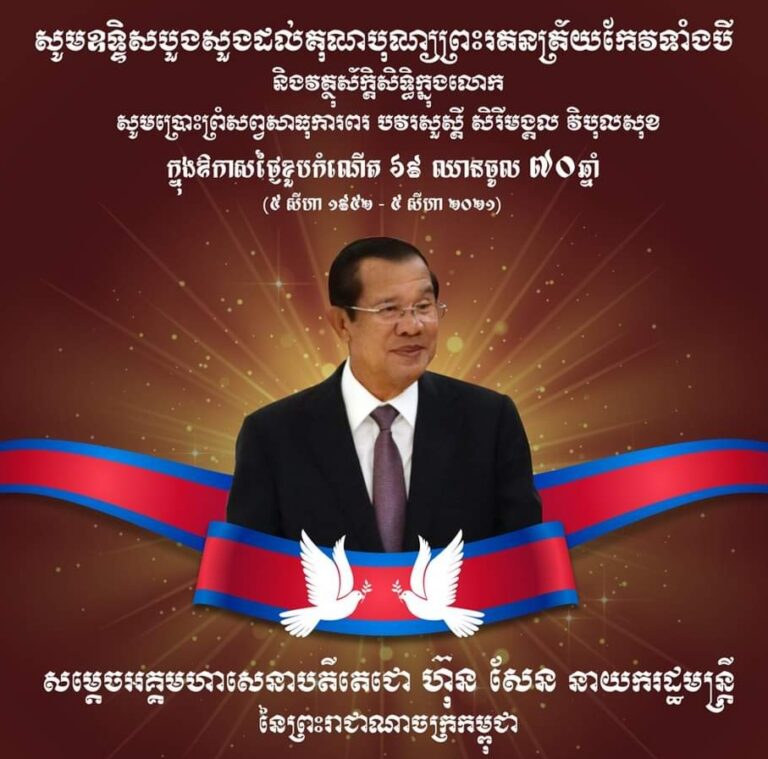 រដ្ឋបាលខេត្តកោះកុង សូមគោរពជូនពរ សម្តេចអគ្គមហាសេនាបតីតេជោ ហ៊ុន សែន នាយករដ្ឋមន្ត្រី នៃព្រះរាជាណាចក្រកម្ពុជា ក្នុងឱកាសប្រារព្ធខួបកំណើតគម្រប់ ៦៩ ឆ្នាំ ឈានចូល ៧០ ឆ្នាំ
