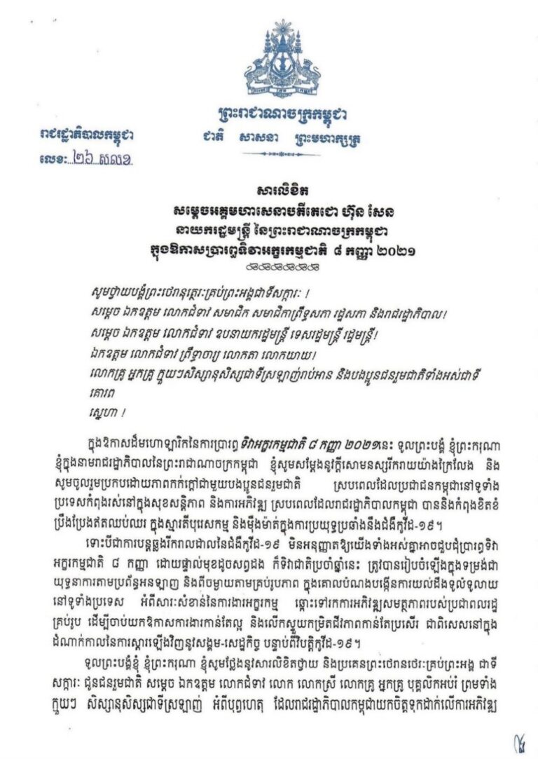 សារលិខិតរបស់សម្ដេចតេជោ ក្នុងឱកាសទិវាអក្ខរកម្មជាតិ ៨ កញ្ញា ២០២១